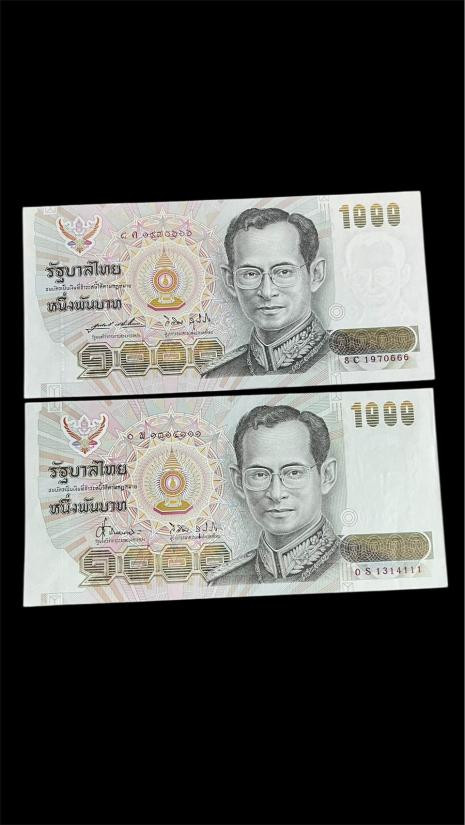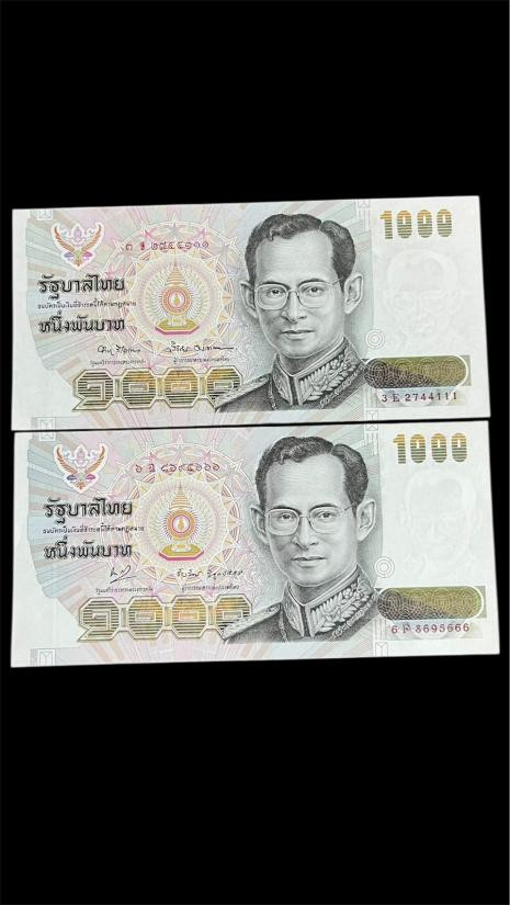 ธนบัตร 1000 บาท แบบ 14 (จัมโบ้) เลข 3 E 2744111 กับ 6 F 8695666 ลายน้ำในหลวง สภาพไม่ผ่านใช้ สวย |