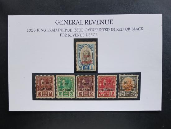 แสตมป์รัชกาลที่ 7 ประชาธิปก ปี 2471 พิมพ์ทับ อากรแสตมป์ จำนวน 6 ดวง ใช้แล้ว ตำหนิบางดวงมีรอยยับ, ดวง 2 สตางค์มีสองรูตรงกลาง *พิจารณาตามภาพครับ* |