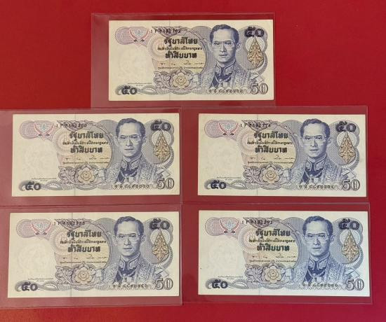 ธนบัตร 50 บาท รัชกาลที่ 9 แบบ 13 ลายน้ำสมเด็จย่า จำนวน 5 ใบ สภาพสวยตามรูป |