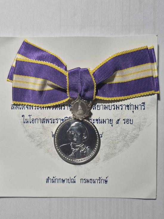 วัดใจ เคาะเดียวแดง เหรียญแพรแถบ สมเด็จพระเทพ พระชนมายุ 5 รอบ เนื้อเงิน ปี 2558 แบบโบว์ |