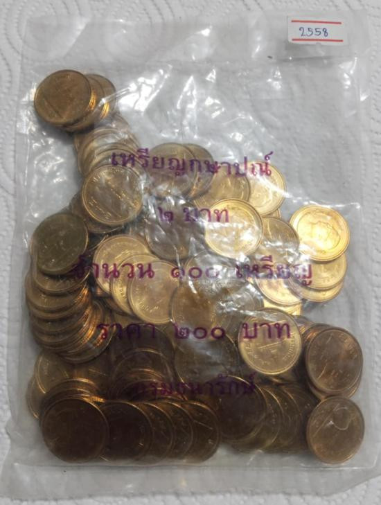 เหรียญ 2 บาท หมุนเวียน พ.ศ.2558 ในสมัยรัชกาลที่ 9 จำนวน 1 ถุง มี 100 เหรียญ ไม่ผ่านการใช้งาน UNC ครับ |