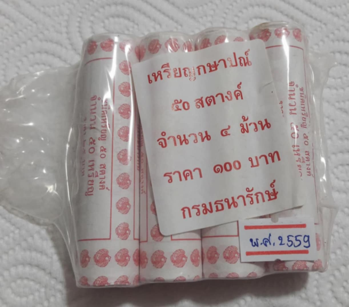 เหรียญ 50 สตางค์ หมุนเวียน ในสมัยรัชกาลที่ 9 พ.ศ.2559 ปีสวรรคตของรัชกาลที่ 9 จำนวน 4 หลอด หลอดล่ะ 50 เหรียญ รวมเป็น 200 เหรียญ เหรียญไม่ผ่านการใช้งาน UNC แพ็คเดิมจากกรมธนารักษ์ ครับ |