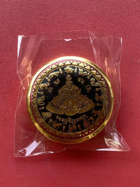 เคาะเดียวแดง สีผึ้งพระราหู รุ่น มงคลจักรวาล เนื้อ โลหะชุบทองลงยาสีดำขอบสีดำ ขนาด5ซม |