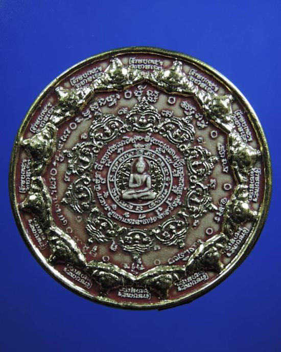 เคาะเดียวแดง สีผึ้งพระราหู รุ่น มงคลจักรวาล เนื้อ โลหะชุบทองลงยาสีแดงขอบสีน้ำเงิน ขนาด3.2ซม |