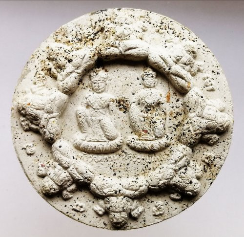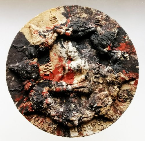 ปฐมอรหันต์สุวรรณภูมิ เนื้อดินเผา เคลือบสีส้ม มีองค์พระ แจกกรรมการ ขนาด 5 cm สวยงามครับ |