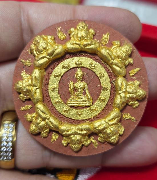 เคาะเดียวแดง สีผึ้งพระราหู รุ่น มงคลจักรวาล เนื้อ โลหะชุบทองลงยาสีดำขอบสีแดง ขนาด5ซม |