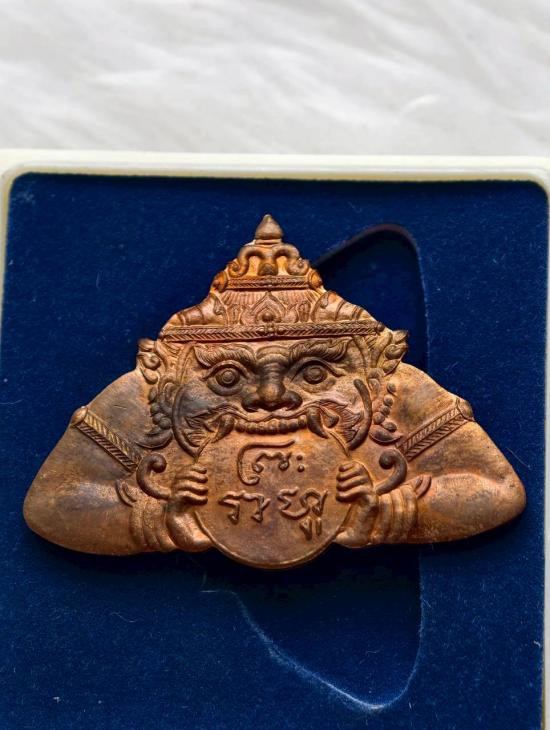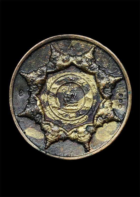 องค์พ่อจตุคามรามเทพ ปางเปิดโลก ประทับราหู หลังพญาชิงชัย พิธีเขาคา ปี 2544 เนื้อทองแดง |