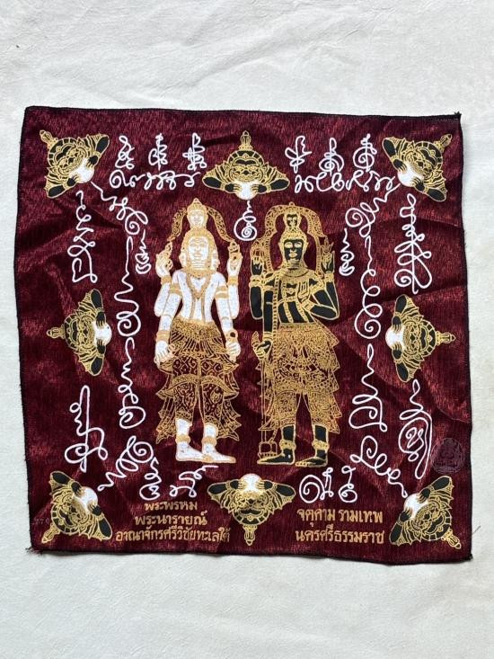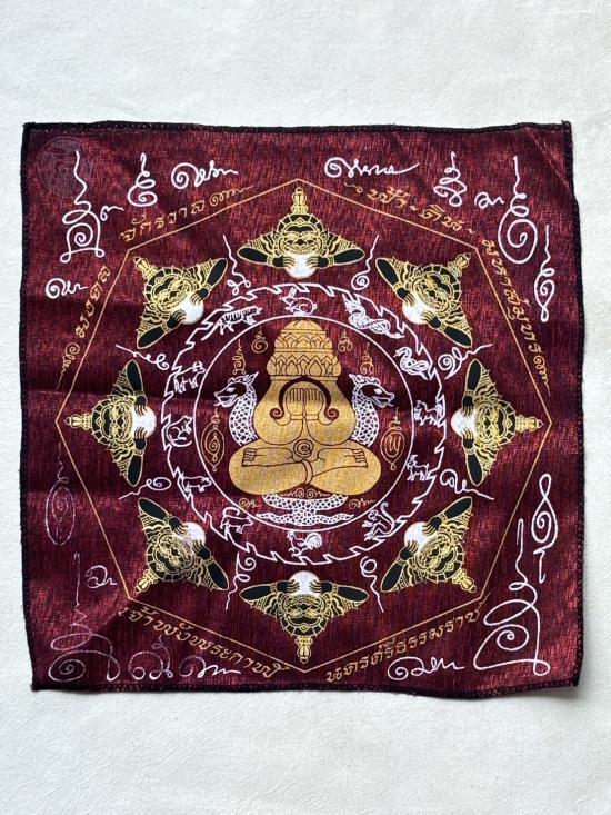 เคาะเดียวแดง ผ้ายันต์ พระพรหม พระนารายณ์ มิ่งมงคล รุ่นมงคลจักวาล ขนาด40/40ซม มีตราประทับ เลข 770 สีแดง |