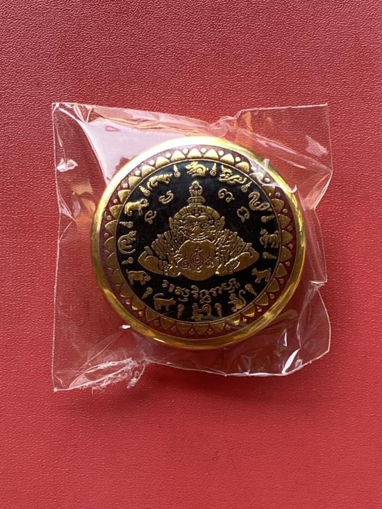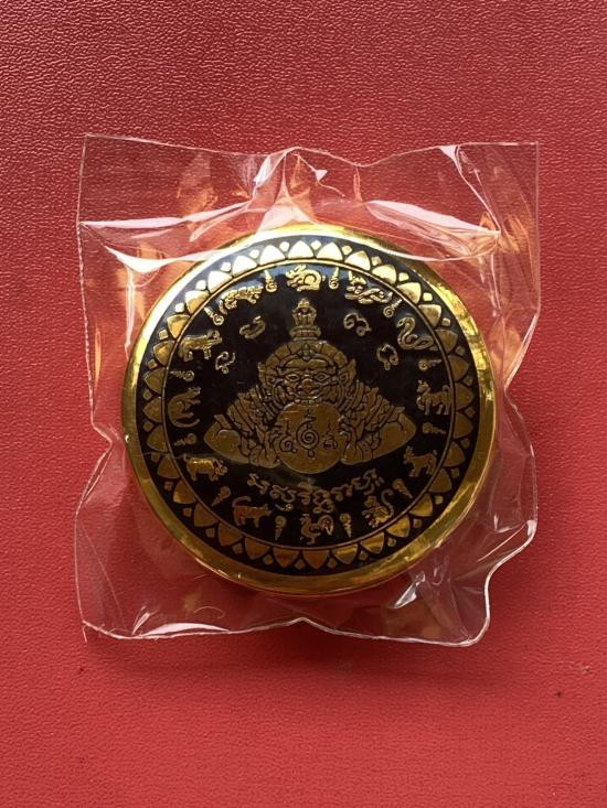 เคาะเดียวแดง สีผึ้งพระราหู รุ่น มงคลจักรวาล เนื้อ โลหะชุบทองลงยาสีดำขอบสีดำ ขนาด5ซม |