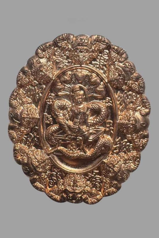 เหรียญบาตรน้ำมนต์พระเทวราชโพธิสัตว์จตุคามรามเทพ หลัง พญาชิงชัย รุ่นจักรพรรดิมหาราช 2550 เนื้อทองแดง 5.5 CM.