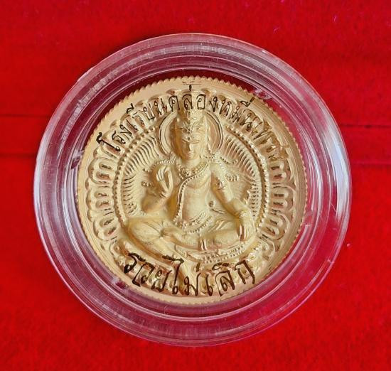 เหรียญองค์พ่อจตุคาม รุ่น รวยไม่เลิก เหรียญแจกศูนย์จอง ชุบทองพ่นทราย ลงยาแดง ขนาด 3.2 ซม. ไม่มีกล่อง