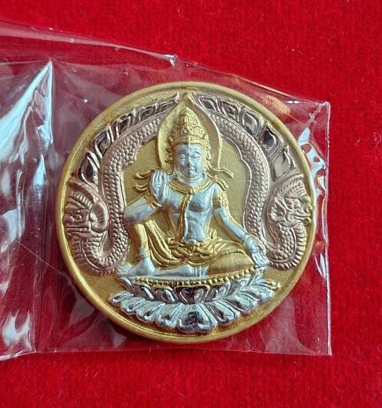 เหรียญท้าวเวสสุวรรณ (เหนือดวง-พลิกดวง) เนื้ออัลปาก้าลงยาชมพู อาจารย์โชติ วัดพุทไธศวรรษ ปี 2565 หมายเลข ๑๖๑๙ กล่องเดิม