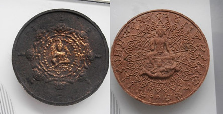เหรียญบาตรน้ำมนต์เนื้อชุบทอง จตุคามรามเทพ หลัง พระปิดตาพังพระกาฬ รุ่นอัครมหาเศรษฐี วัดพระมหาธาตุวรมหาวิหาร |