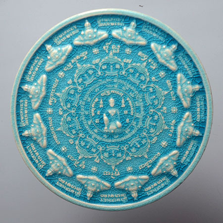 จตุคามรามเทพ รุ่น มหาเทวโพธิสัตว์สุวรรณภูมิ ปี 2550 กระเบื้องเคลือบสีฟ้า ( สีทูลเกล้า ) + เคลือบแดง หลังเจดีย์