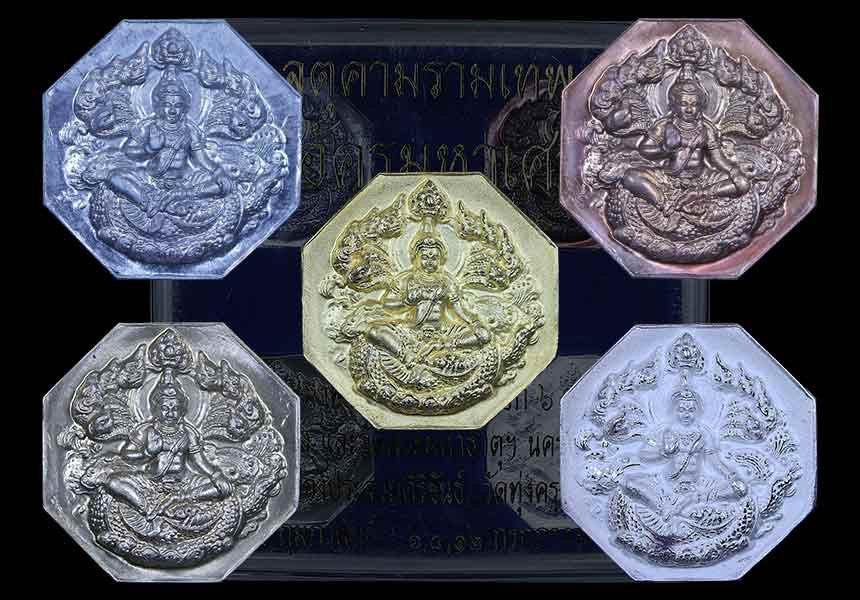 เหรียญจตุคามรามเทพ รุ่น " อัครมหาเศรษฐี " 1 ชุด ประกอบด้วย เหรียญชุบทองพ่นทราย ชุบเงินพ่นทราย เนื้อตะกั่ว เนื้อแร่ผสม และเนื้อทองแดง พิมแปดเหลี่ยม มีโค้ชทุกเหรียญ ขนาด 3.5 cm พร้อมกล่อง |