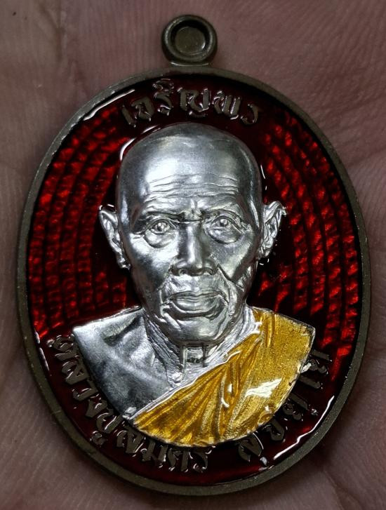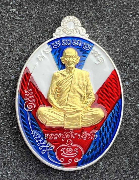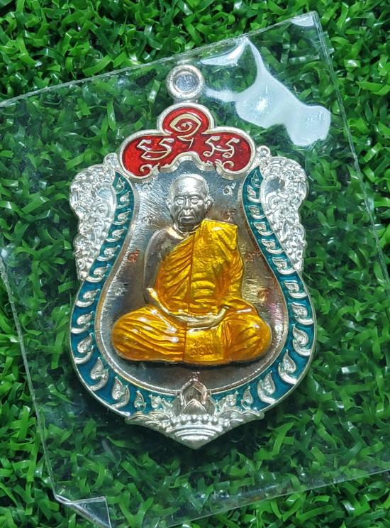 เหรียญเสมา รุ่นแรก สมปรารถนา หลวงปู่ล้อม สีลสวโร วัดป่าเมตตาธรรม ปี 2561 เนื้อเงินลงยา ตอก ๙ รอบ หมายเลข ๕