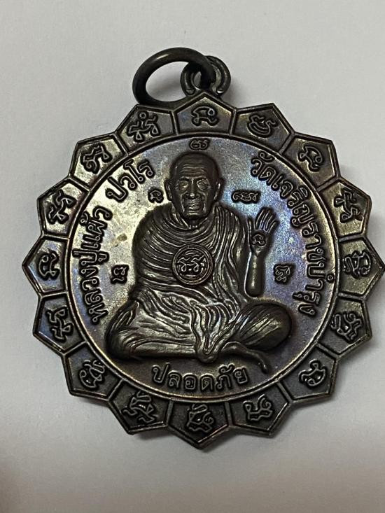 เหรียญปลอดภัย 16จักร ปี2550 หลวงปู่แผ้ว ปวโร วัดเจริญราชบำรุง (หนองพงนก) กำแพงแสน นครปฐม |