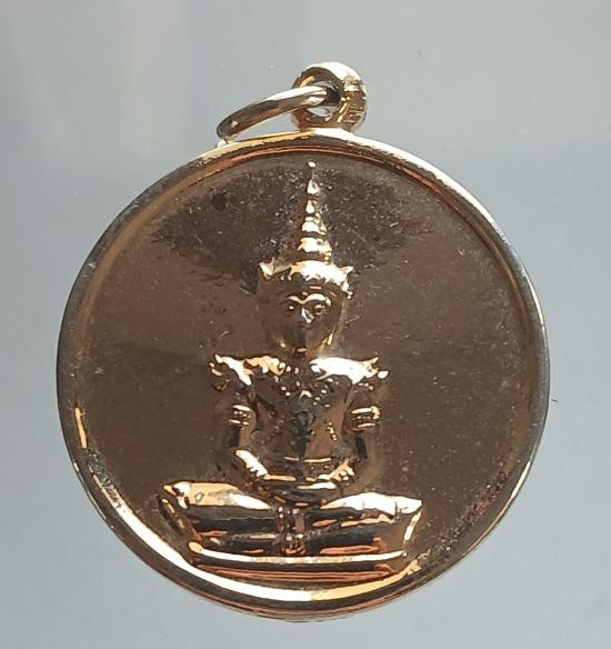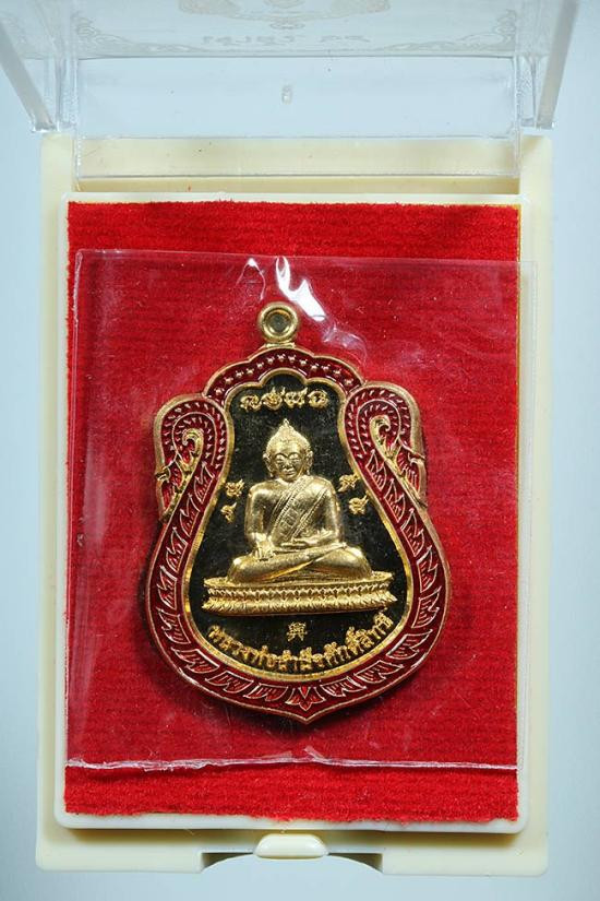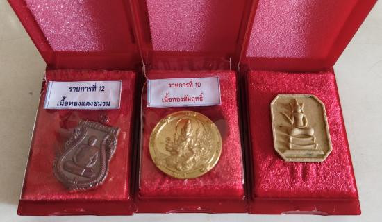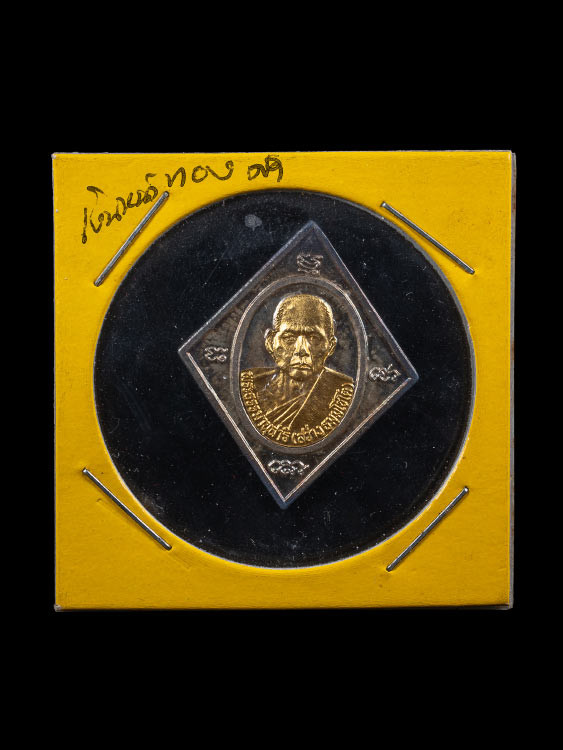 เหรียญหลวงปู่ฝั้น วัดศรีลมอรัตย์ เพชรบูรณ์ รุ่นเมตตามหานิยม เนื้อนวะน้ำทองฝังพลอย กรอบชุบทอง หมายเลข 3 |