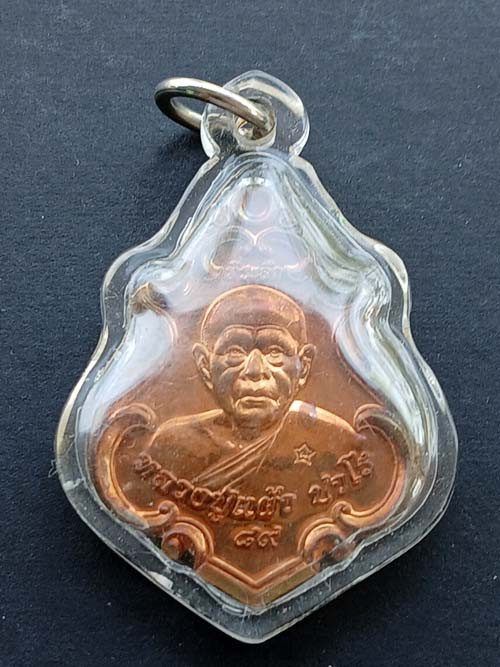 เหรียญหลวงปู่ฝั้น วัดศรีลมอรัตย์ เพชรบูรณ์ รุ่นเมตตามหานิยม เนื้ออัลปาก้าซาตินจีวรส้ม หมายเลข 33 |