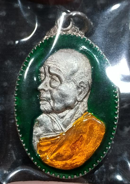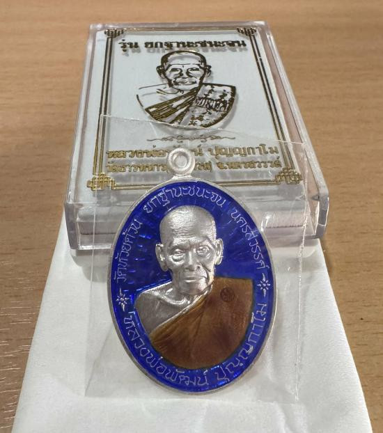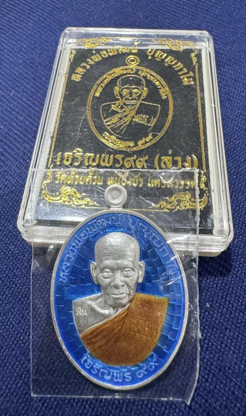 เหรียญหันข้าง เนื้อเงินลงยา ปี 2550 หลวงปู่แผ้ว ปวโร วัดรางหมัน ลงยาสีน้ำเงินหมายเลข 289 |