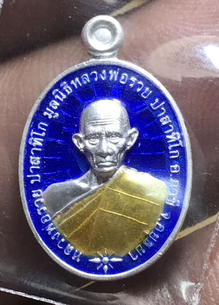 เหรียญห่วงเชื่อมรุ่นแรก หลวงพ่อหลาย วัดคันลัด จ.สมุทรปราการ เนื้อเงินลงยาน้ำเงินมีจาร |