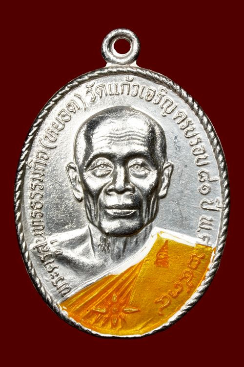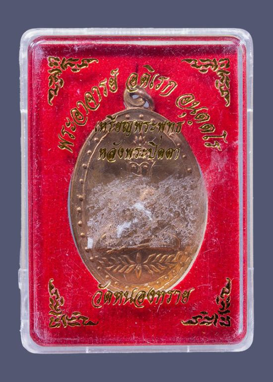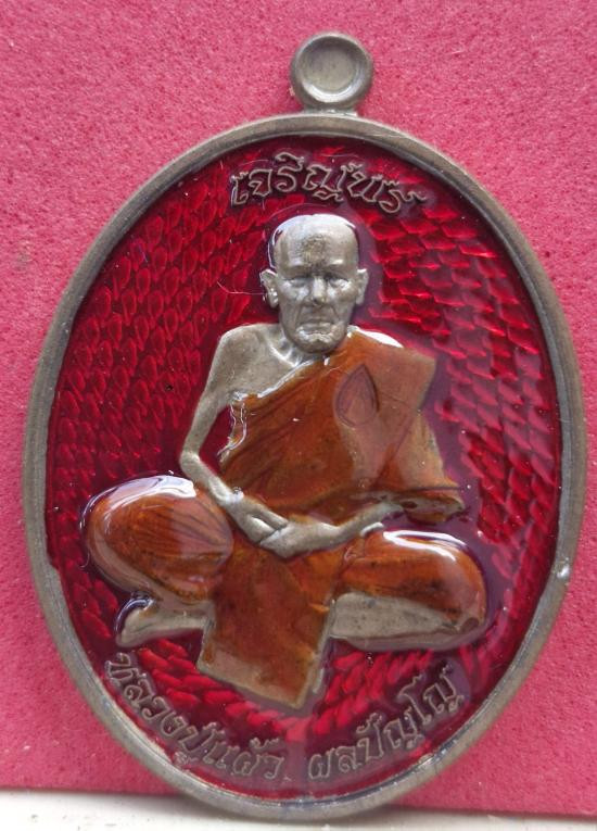เคาะเดียวแดง เหรียญหลวงปู่แผ้ว สำนักปฏิบัติธรรมบ้านใสหลวง รุ่นเจริญพร เนื้อสัตตะลงยา |