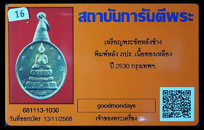เหรียญพระชัยหลังช้าง เนื้อทองเหลือง ปี2530 หลวงพ่อฤาษีลิงดำร่วมปลุกเสก |
