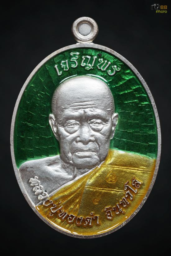 เหรียญเจริญพรมหาเศรษฐี รุ่นฉลองอายุ90 ปี เนื้อเงินลงยาสีเขียวหลังสีแดง สร้าง 10 เหรียญ ปี2564 หลวงปู่ทองดำ วัดถ้ำตะเพียนทอง จ. ลพบุรี