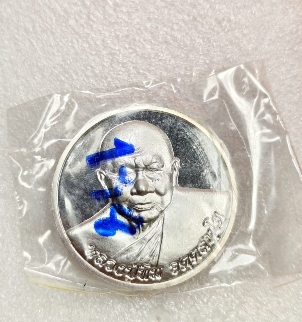เหรียญแสตมป์หลวงปู่ มี วัดมารวิชัย อยุธยา น้ำหนักเงิน 14.2 กรัม รุ่นมหาเศรษฐีเสาร์ 5 มีไม่จน เนื้อเงิน ปี 2539 ตอกโค๊ต |