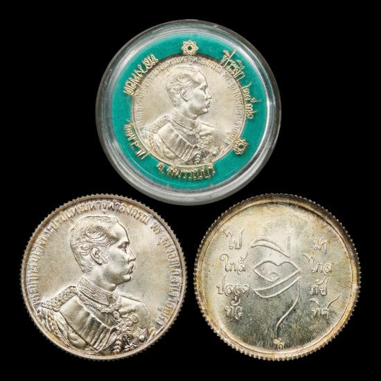 เหรียญรัชกาลที่ ๕ เนื้อเงิน ตอกโค๊ต "ดี" พิมพ์ใหญ่ หลวงปู่ดี วัดพระรูป สุพรรณบุรี พร้อมตลับใส่เหรียญจากวัด |