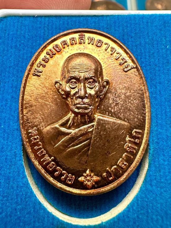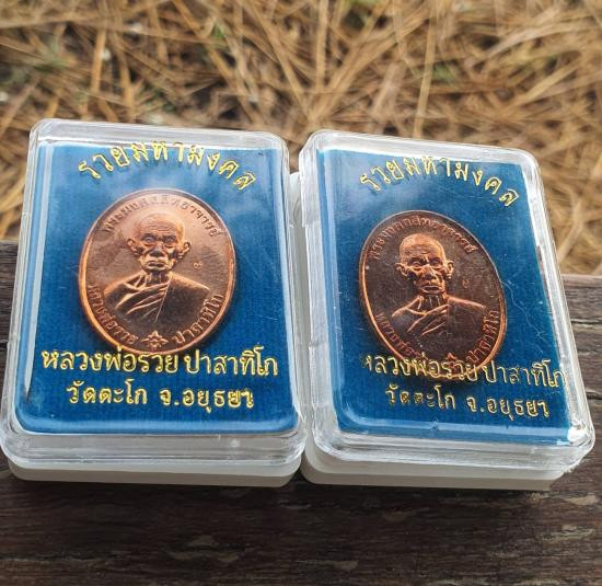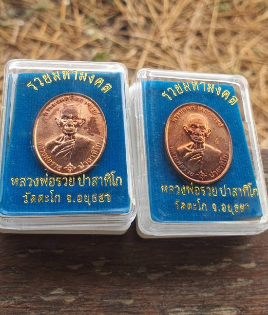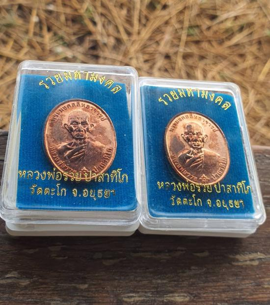 เหรียญหลวงพ่อรวย วัดตะโก รุ่นไตรมาส 59 รวยรวยรวย เนื้อทองแดงลงยา ปี 2559 จ.พระนครศรีอยุธยา เลี่ยมทองคำแท้ |