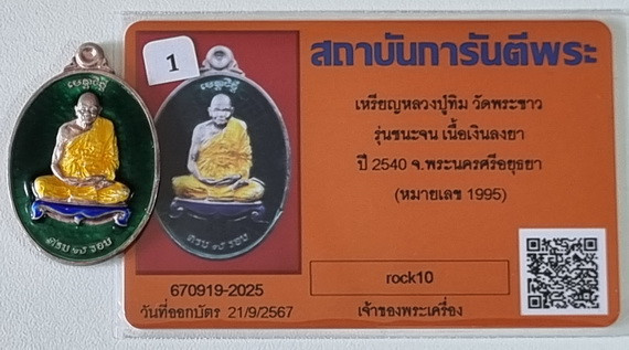 เหรียญหลวงปู่ทิม วีดพระขาว รุ่นชนะจน เนื้อเงินลงยาสีเขียว ปี2540 อยุธยา เลช1995 สภาพสวยมาก มาพร้อมบัตรรับรองจีพระ |
