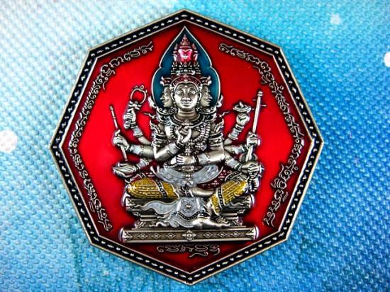 เหรียญ พระพรหม ปรทานพร เนื้ออัลปาก้าซาติน ลงยาเครื่องทรง ขอบแดง รัศมียาว วัดพระยาสุเรนทร์ จ.กรุงเทพ พร้อมกล่องเดิม(กล่องเดิมมีรอยร้าว) (---A52---)