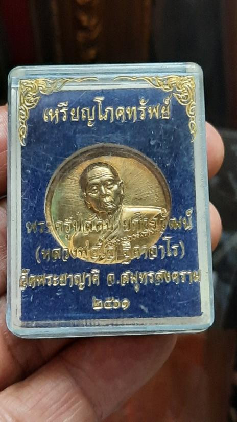เหรียญโภคทรัพย์ หลวงพ่อใจ วัดพระยาญาติ จ.สมุทรสงคราม ปี61 เนื้อทองทิพย์ตอกโค๊ต/หมายเลข 643 พร้อมกล่อง |