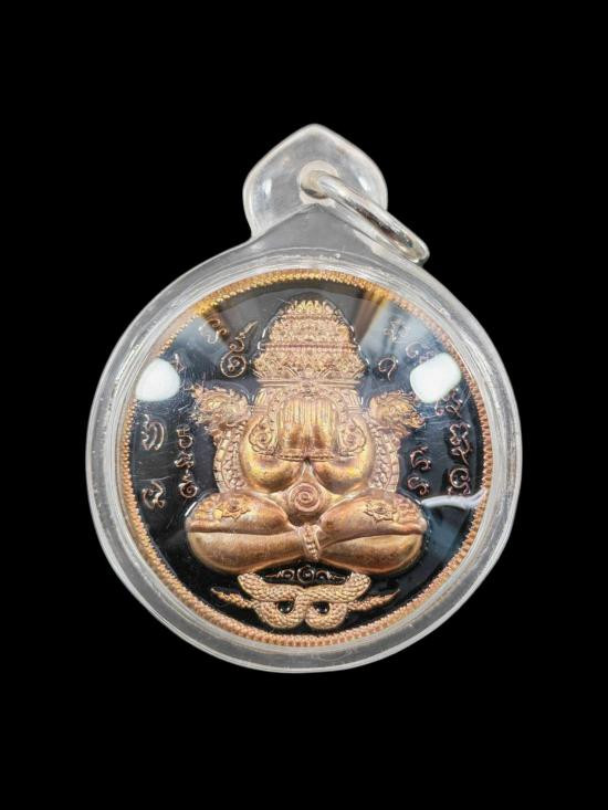พระปิดตาพังพระกาฬ รุ่น เจ้าสัวพันล้าน โดย บอยท่าพระจันทร์ รายการลุ้นเนื้อ เนื้อทองแดงผิวรุ้งลงยาดำ เลข 4938 กล่องเดิม |