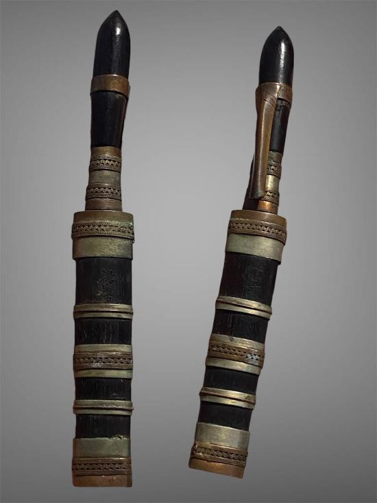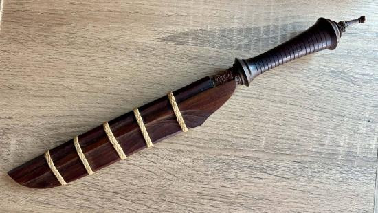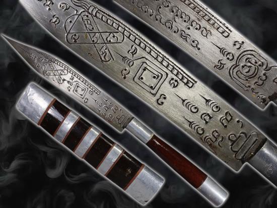 มีดหมอสาริกาเก่า ด้ามมีดไม้ ปลอกมีดไม้ แหนมรัดสามกษัตริย์ ขนาดความยาวรวมด้ามมีด 4.8 นิ้ว ไม่ทราบที่ มีจารย์ที่ใบมีดและปลอกมีด