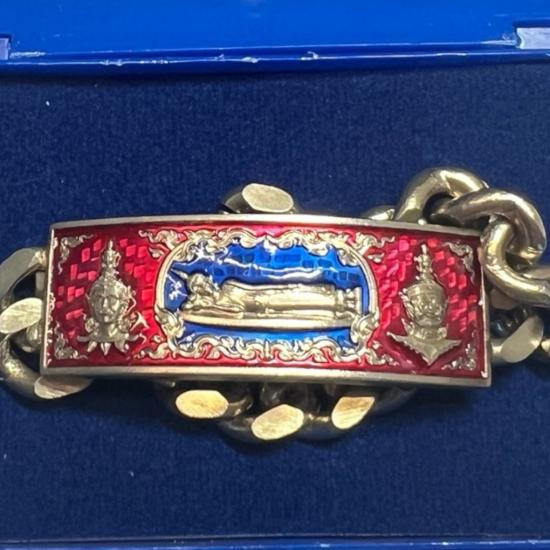เลสข้อมือ ท้าวเวสสุวรรณจาตุมหาราชิกา หลวงพ่อพระนอนศักดิ์สิทธิ์ วัดพระนอนแม่ปูคา จ. เชียงใหม่ ครูบากฤษดา ร่วมปลุกเสก เนื้ออัลปาก้า ลงยาแดงน้ำเงิน เลข 121 ยาว 7 นิ้ว