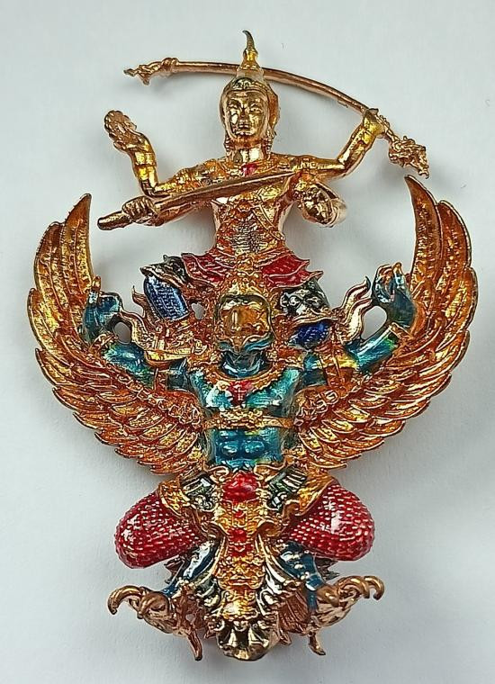 พระนารายณ์ทรงครุฑราชปักษา รุ่น ดวงมหาเศรษฐี หลวงปู่ดวงเศรษฐี วัดหนองไผ่ เนื้อเบญจโลหะลงยา (สูง 4.7 ซม.) "แยกชุดของขวัญ มูลค่า800บาท" เบอร์ 396 พร้อมกล่องเดิมครับ