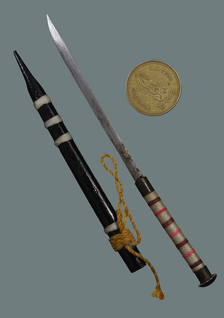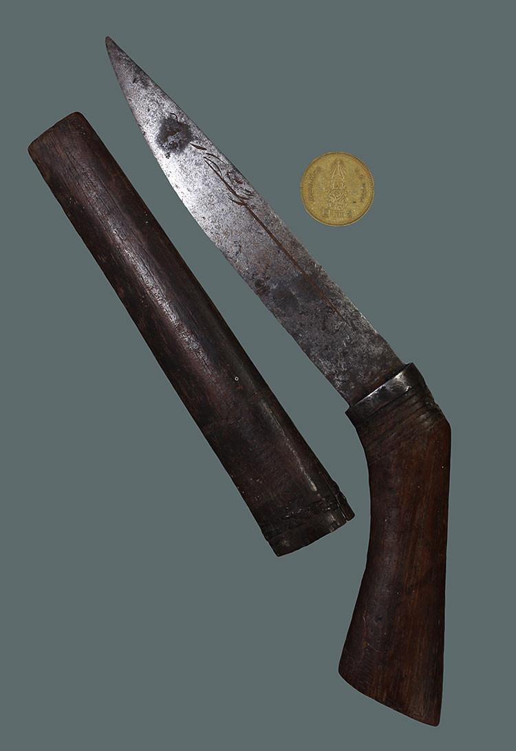 มีดหมอหนังช้างแท้ 2หน้า ลายยันต์ปิดตา กับ นาคเกี้ยว No.4 วาระ 8 รอบหลวงปู่ทองดี จังหวัดอุบลราชธานี พร้อมกล่องไม้เดิมๆ |