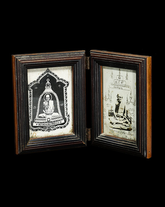 #100#หลวงพ่อเกษม วัดม่วง อ่างทอง " รูปถ่ายหลังแผ่นยันต์ 2 บานคับ |