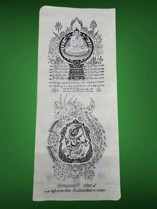 จัดไป....ผ้ายันต์พระพุทธธรรมจักรทิพย์ญาณไตรโลก วัดหนองระกำ อาจารย์หม่อมเขียนออกแบบยันต์ หลวงปู่ละมัยปลุกเสก ขนาด 112x47 ซ.ม. ผืนใหญ่ |