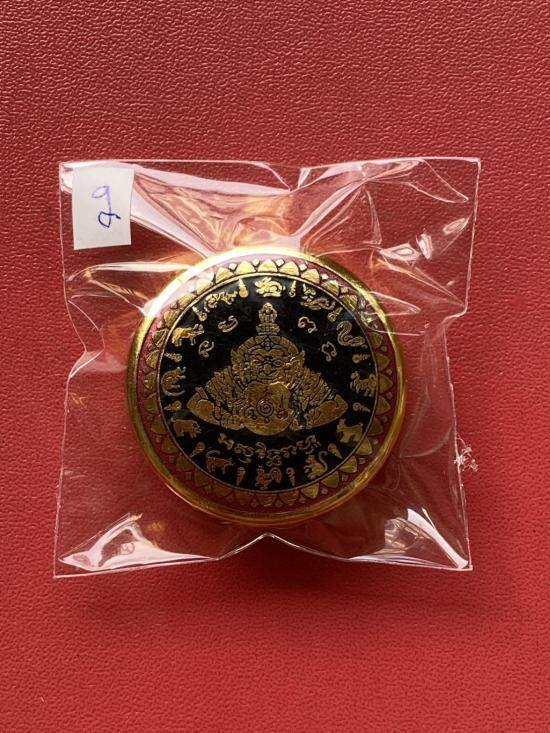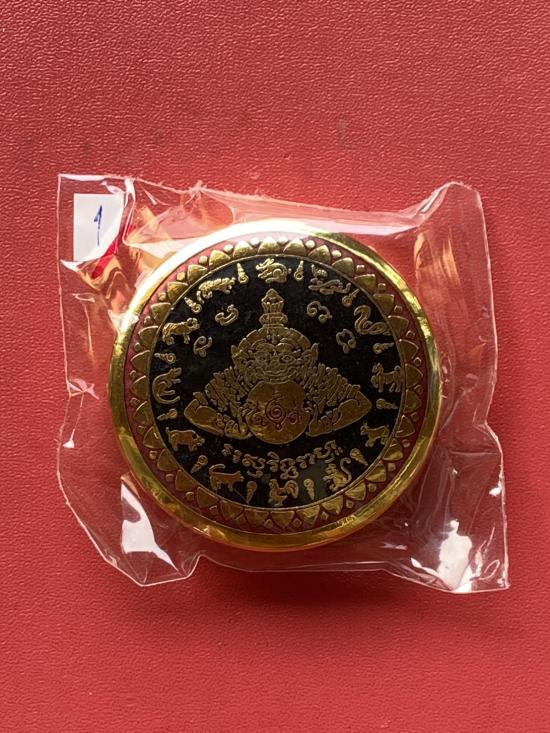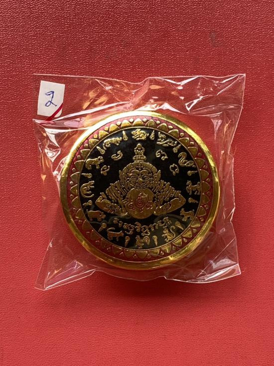 เคาะเดียวแดง สีผึ้งพระราหู รุ่น มงคลจักรวาล เนื้อ โลหะชุบทองลงยาสีดำขอบสีแดง ขนาด 5ซม |