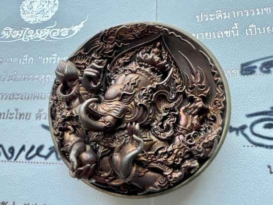 เหรียญโภคทรัพย์ "นางกวักหลังหนุมาน" หลวงพ่อวิชัย วัดหัวเด่น "เนื้อกะไหล่ทอง" (กรรมการ) หมายเลข "6" เลขวันเกิดหลวงพ่อ |