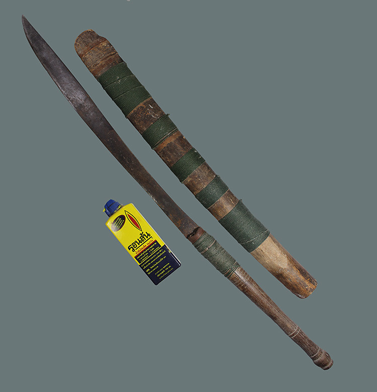 วัดใจ**เครื่องราง มีดดาบเก่า ด้ามไม้+ฝักไม้ ถักหวายลงรัก ยาว 31.นิ้ว.....ตามสภาพครับ |