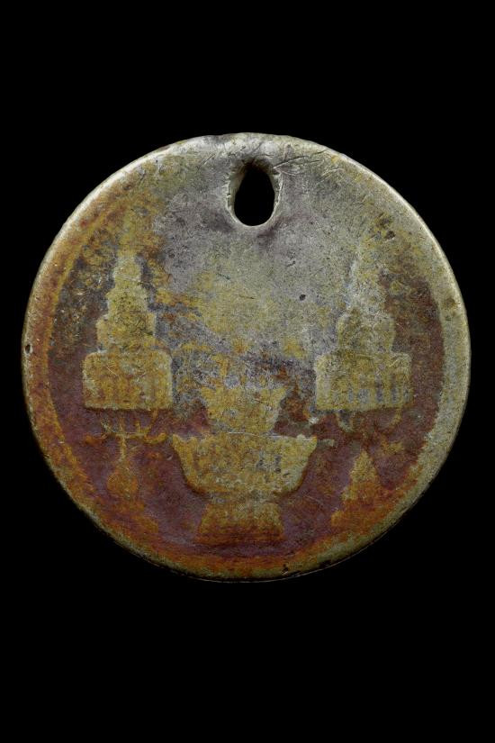 วัดใจ เหรียญรัชกาล พระจุลมงกุฏ - พระแสงจักร เจาะรู มีลงจารยันต์ด้านหลัง หลวงปู่ภู วัดท่าฬ่อ จ. พิจิตร |