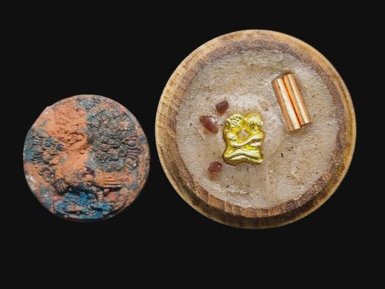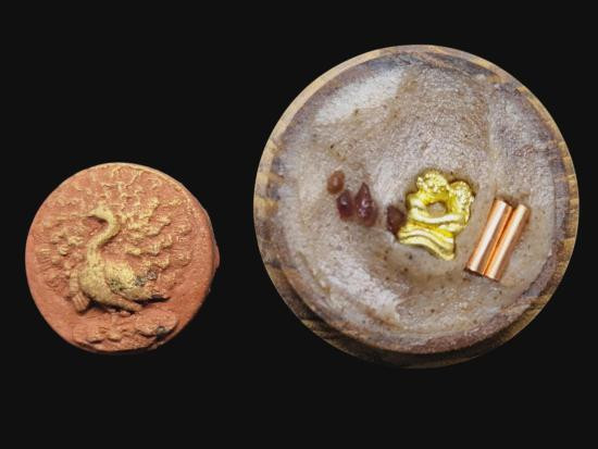 เคาะเดียวแดง พญายูงคำ รุ่นแรก เนื้อผงชาดปัดทอง และ ตลับไม้สีผึ้งเนื้อหอม รังผึ้งร้าง ขวางเดือนขวางตะวัน รุ่นแรก ฝังอิ่น ตะกรุด ในเมตตาบารมี เจ้าปู่จั่นต่า กาวิสาละ ครูบากฤษดา เมตตาเษก |