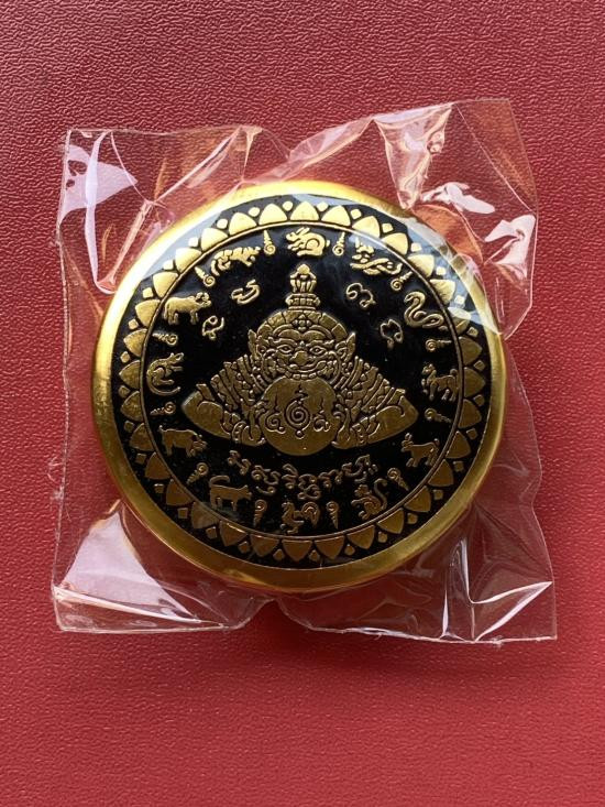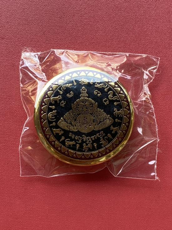 เคาะเดียวแดง สีผึ้งพระราหู รุ่น มงคลจักรวาล เนื้อ โลหะชุบทองลงยาสีดำขอบสีแดง ขนาด5ซม |