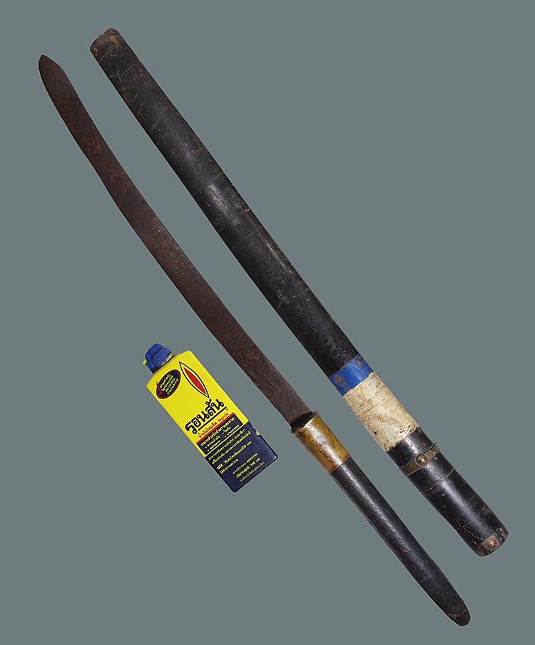 วัดใจ**เครื่องราง มีดดาบ หลวงพ่อรุ่ง วัดหนองสีนวล จ.นครสวรรค์*{ ตอกลายที่สันมีด+อุดชันโรงเก่า }*ยาว 31.นิ้ว ลงรักเก่าที่ฝัก+ด้ามไม้ ปลายมีดหัวปลาหลด หายาก...ตามสภาพครับ |