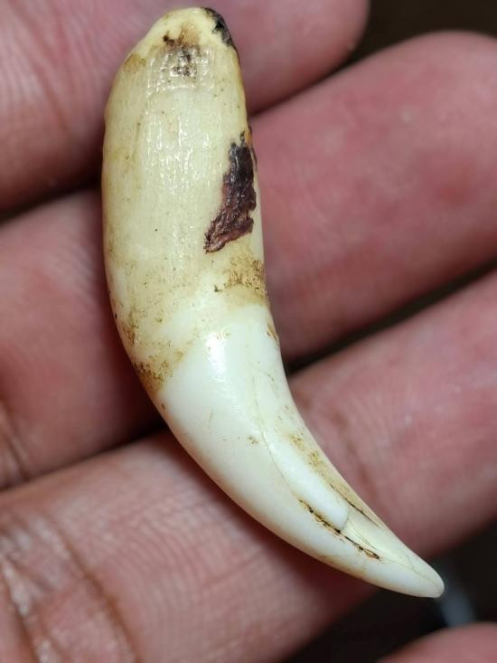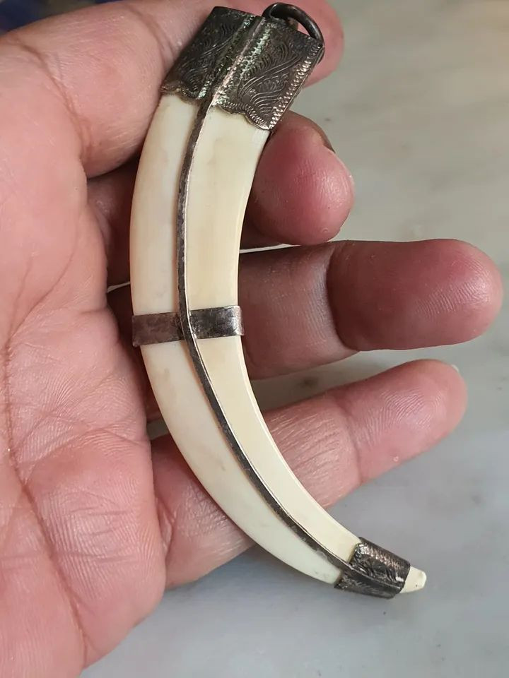 วัดใจ เคาะเดียว เขี้ยวหมูป่าตันๆ จับกระเช้าเงินแท้ จารอักขระรอบเขี้ยวครับ ยาวประมาณ4นิ้ว |