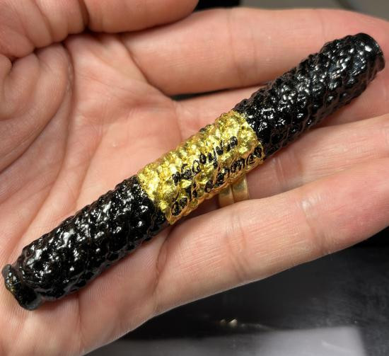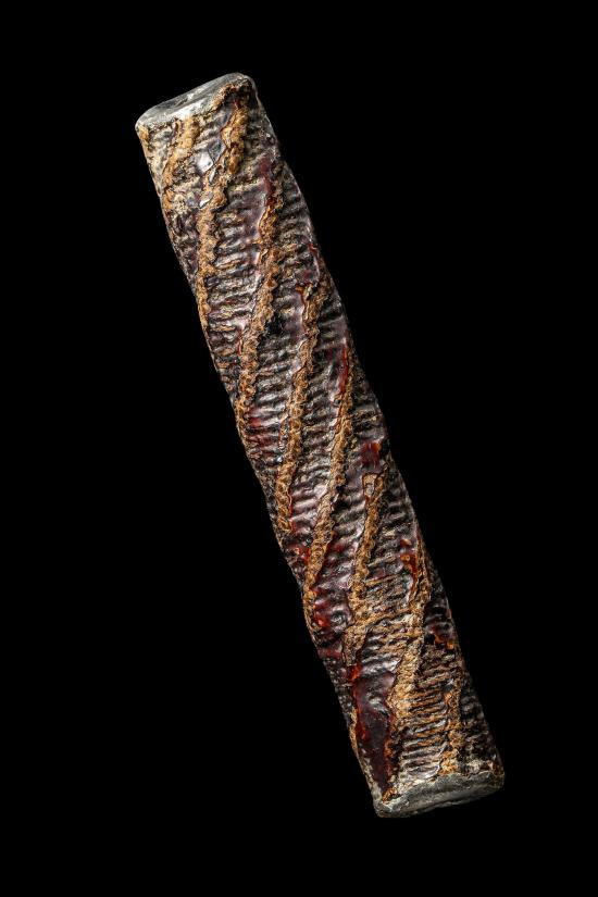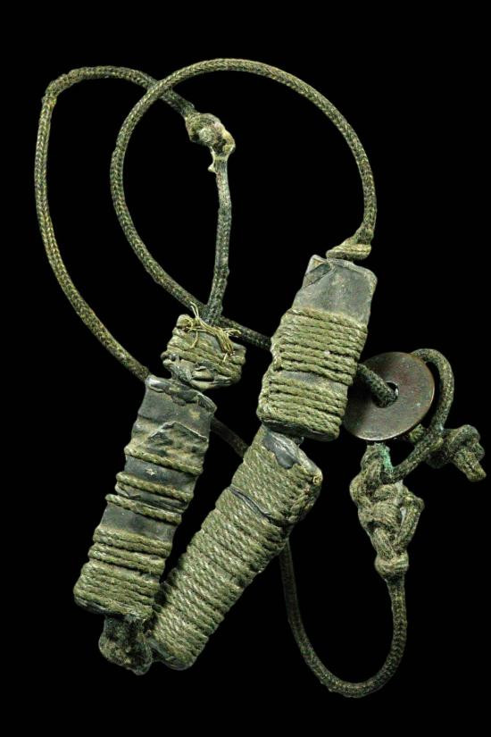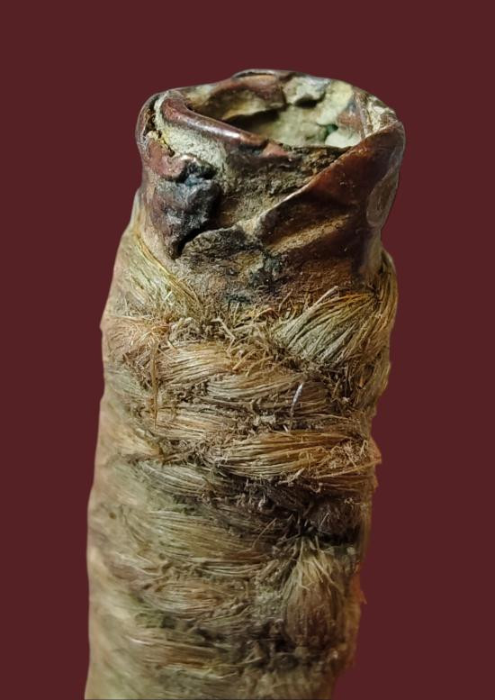 ตะกรุดเนื้อทองแดงถักเชือกปอ มีอายุเก่ายาว 3 นิ้ว |
